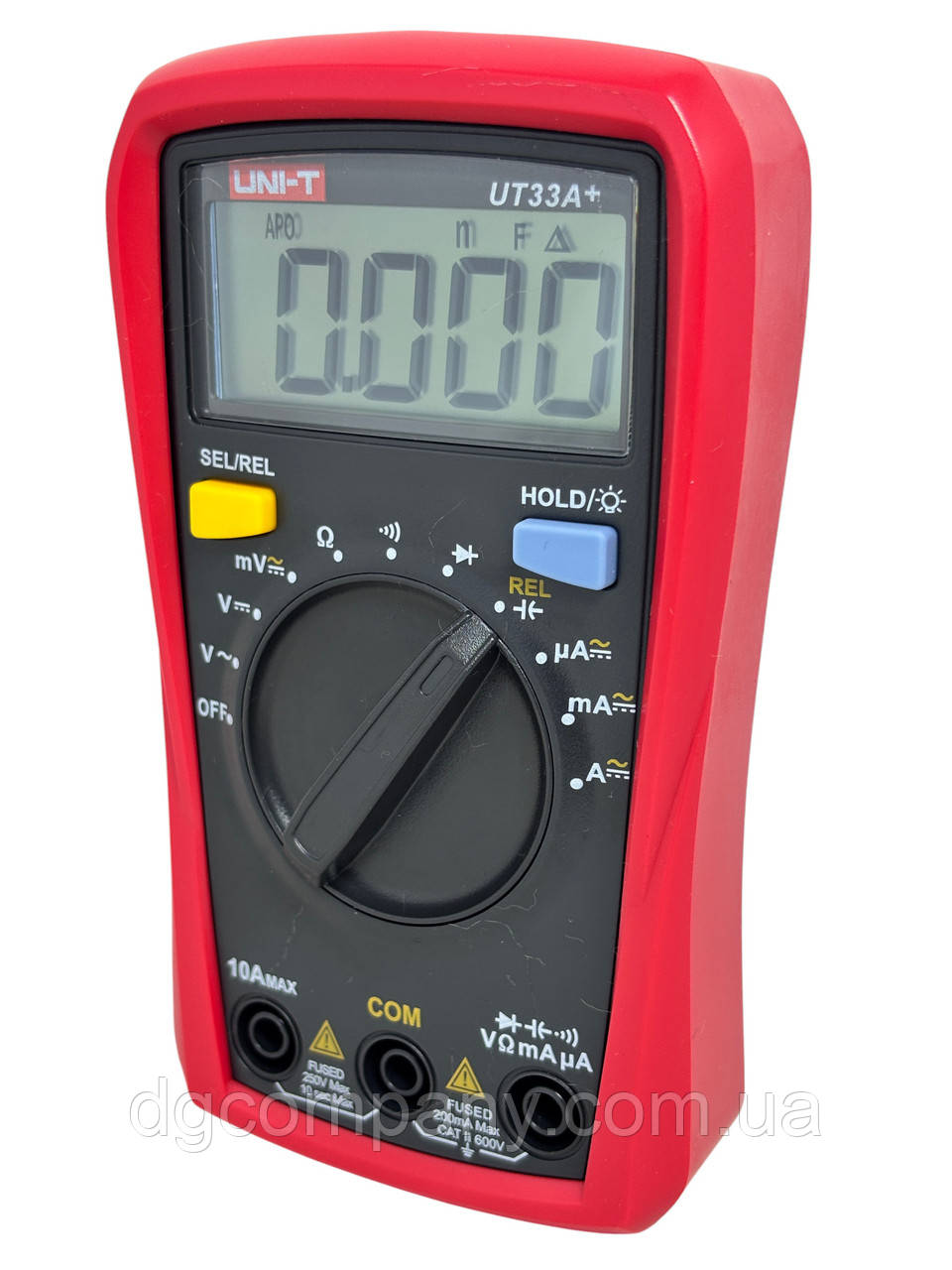 Якісний універсальний цифровий мультиметр Unit-T UT33A+ призначений для вимірювання постійного і змінного напруги, постійного та змінного струму, вимірювання опору, вимірювання ємності,перевірки діодів і транзисторів, прозвонки зі звуковим сигналом електричних ланцюгів. Мультиметр Unit UT33A+ має підсвічування екрану та функцію збереження даних.Присутній режим автовимкнення. Мультиметр Unit 33a+ виготовлений в обрезиненном корпусі і витримує падіння з висоти 2м.